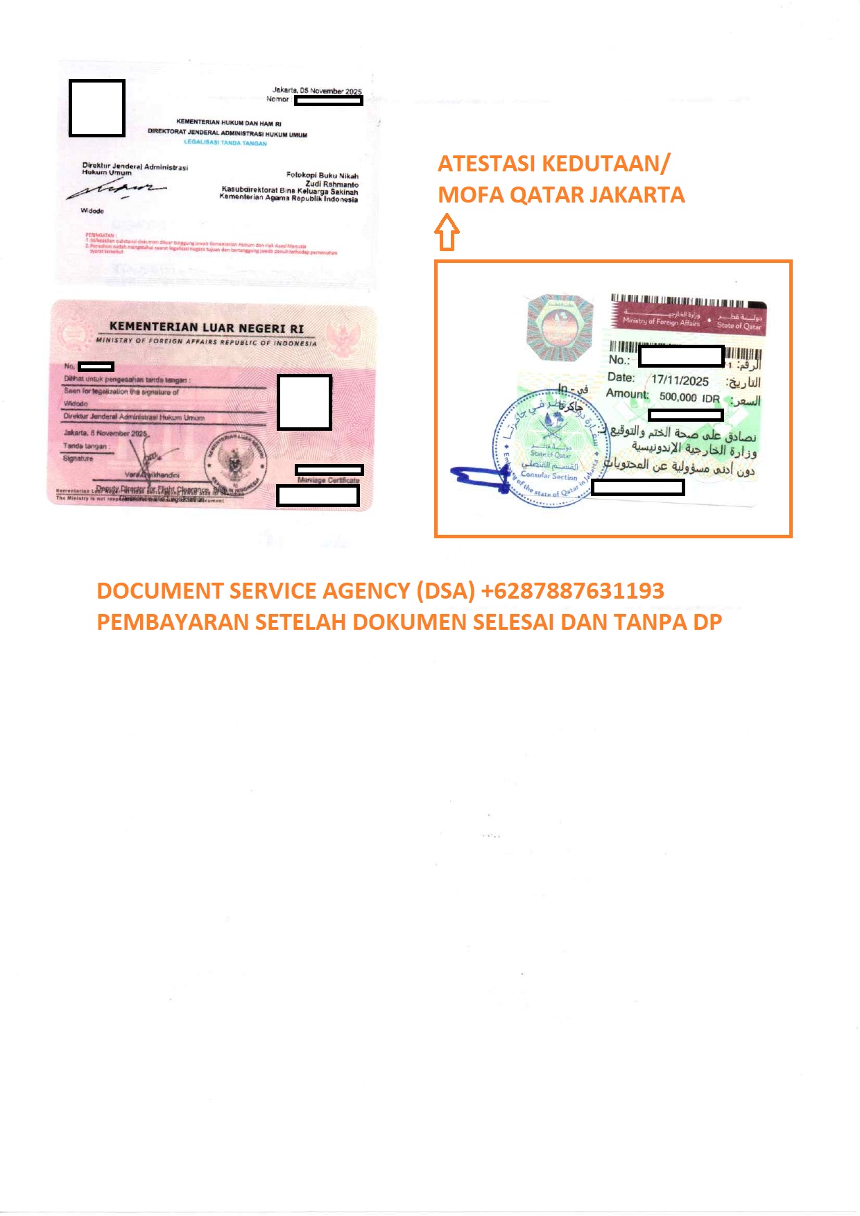 DSA (Document Service Agency) adalah spesialis jasa terjemah, legalisir, atestasi, apostile dokumen untuk keperluan di luar negeri dan pengurusan visa berpengalaman dan terpercaya. Bagi anda yang ingin melegalisir buku nikah di Kedutaan Qatar untuk keperluan bekerja, pengurusan visa, izin tinggal, dan lain-lain. Percayakan legalisir dokumen anda kepada kami, dengan layanan ” Pembayaran Setelah Dokumen Selesai dan Tanpa DP ” anda akan merasa lebih nyaman dan aman menggunakan jasa kami. Dan dalam hitungan beberapa hari dokumen anda selesai dan siap untuk digunakan.
