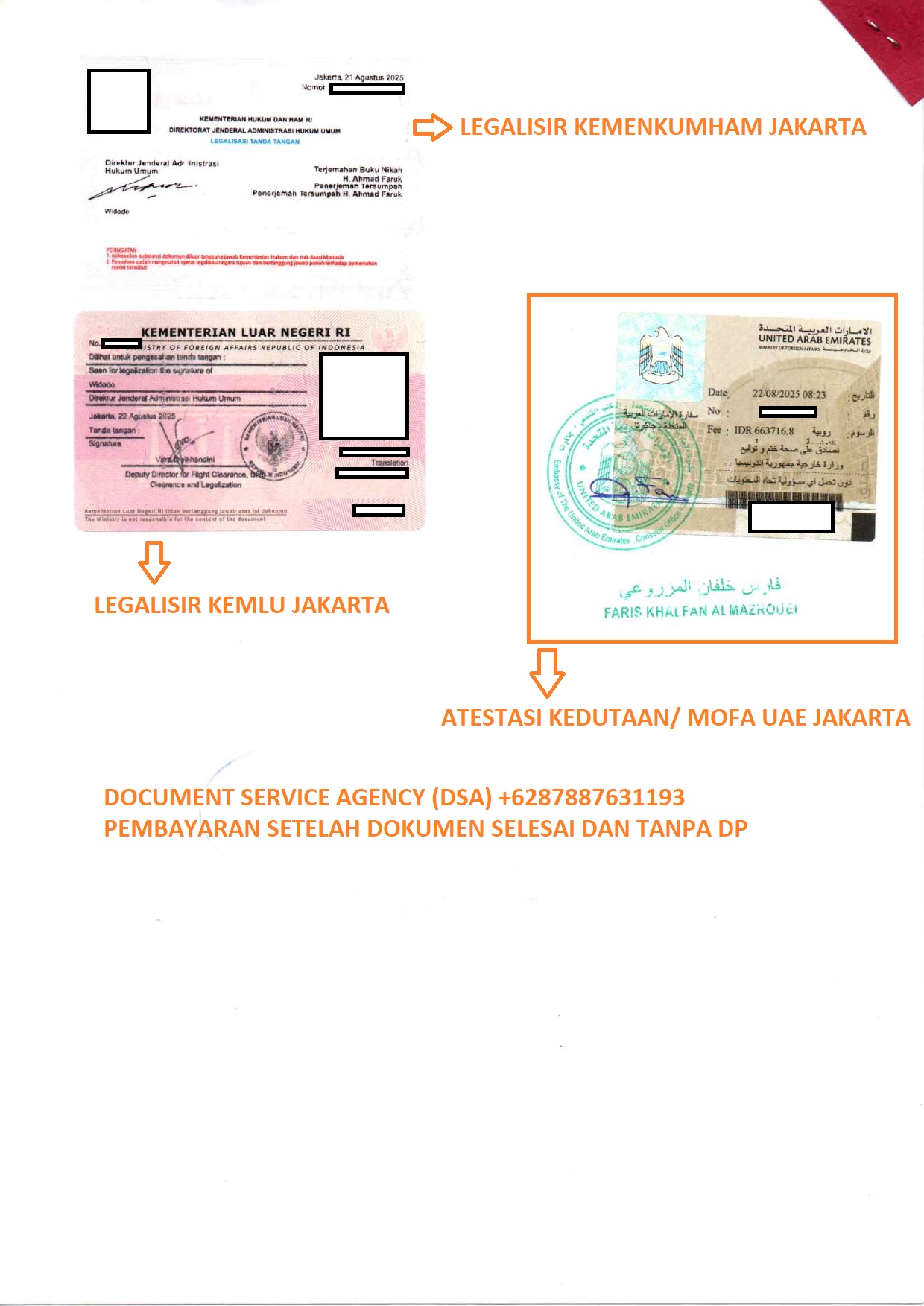 DSA (Document Service Agency) adalah spesialis jasa terjemah, legalisir, atestasi, apostile dokumen untuk keperluan di luar negeri dan pengurusan visa berpengalaman dan terpercaya. Bagi anda yang ingin melegalisir akta nikah di Kedutaan Uni Emirates Arab/ UAE untuk keperluan pengurusan visa, izin tinggal, pendaftaran pernikahan dan lain-lain. Anda tidak perlu datang ke Jakarta karna pengurusan dokumen anda bisa diwakilakan kepada kami, dengan layanan ” Pembayaran Setelah Dokumen Selesai dan Tanpa DP ” membuat anda lebih nyaman dan aman menggunakan jasa kami.