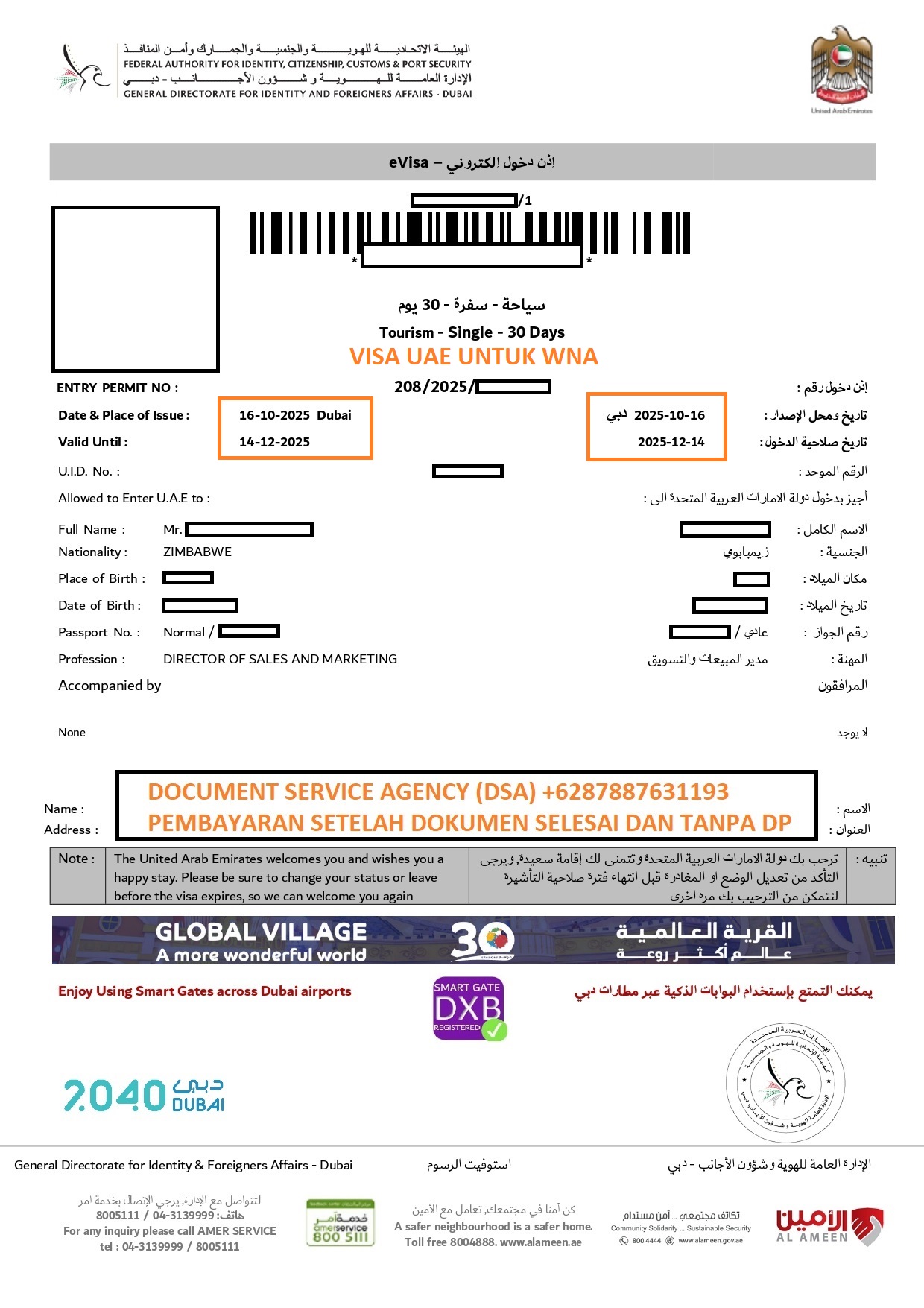 Document Service Agency (DSA) adalah spesialis jasa terjemah, legalisir, atestasi, apostile dokumen dan pengurusan visa terpercaya dan berpengalaman. Bagi anda yang ingin berkunjung ke Dubai/ UAE dalam rangka wisata atau liburan tidak perlu datang ke Jakarta untuk pengurusan visa atau dokumen lainnya, karena pengurusan visa bisa diwakilkan ke kami. Dengan layanan “Pembayaran Setelah Dokumen Selesai dan Tanpa DP” membuat anda nyaman dan aman menggunakan jasa kami. Dan Dalam hitungan beberapa hari dokumen anda selesai dan siap untuk digunakan.